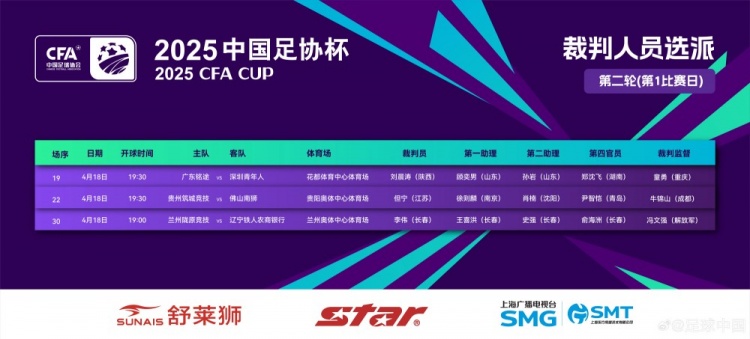 4月18日讯 今天将进行足协杯第二轮第1比赛日3场比赛,目前裁判选派结果已经出炉。