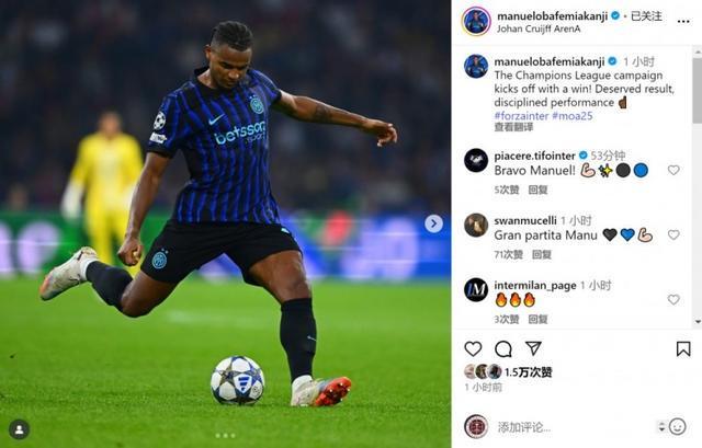 阿坎吉社媒晒出比赛照片,并写道:“以一场胜利开启欧冠征程,实至名归的结果,纪律严明的表现。”