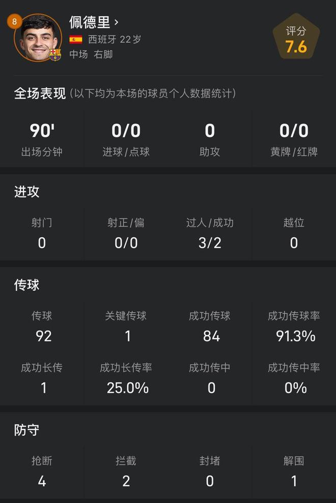 德容&佩德里数据:前者传球成功率为99%,后者贡献3过人