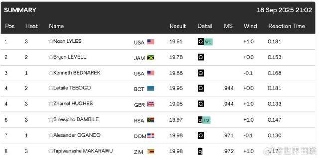 9月18日,2025年东京田径世锦赛男子200米半决赛刚刚结束,第3组的莱尔斯以明显优势拿到第一,19秒51更是刷新本赛季世界最佳。