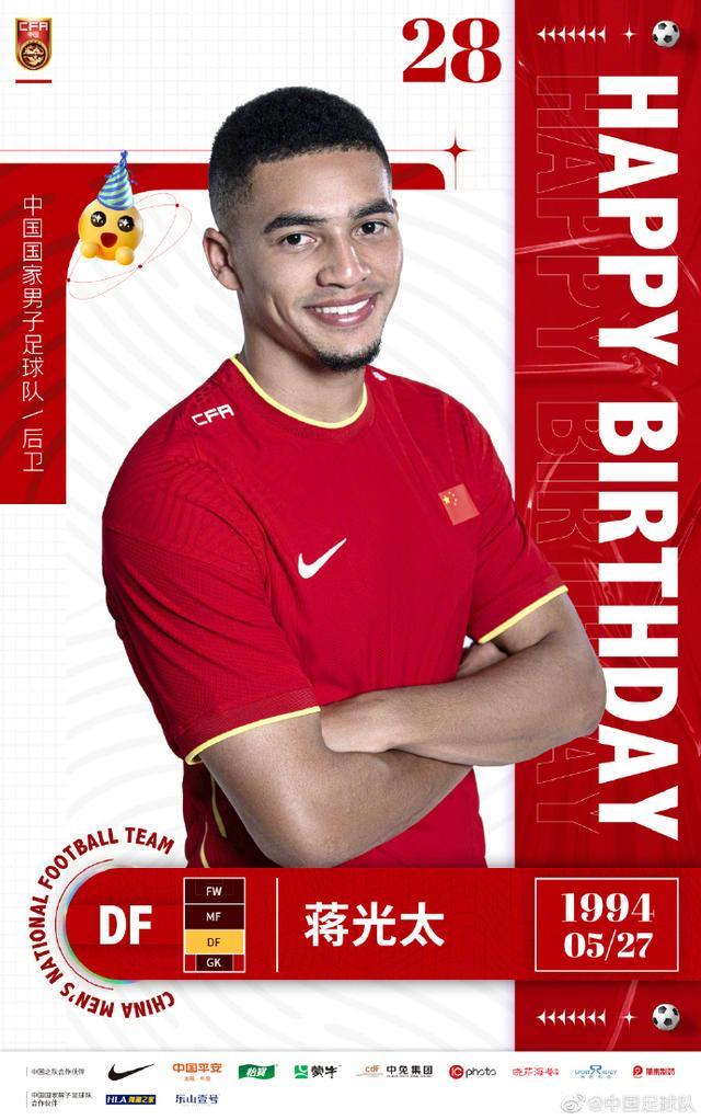 今年5月27日,中国足球队官方微博发布了对国脚球员蒋光太的生日祝福:场上,你身体强壮、擅长对抗;场下,你低调内敛、笑容腼腆。27岁“反差萌”大男孩儿蒋光太生日快乐!四十强赛即将重燃战火,愿你成为国足后场定海神针!蒋光太出生于1994年5月27日,他出生于英国利物浦,祖籍广东江门,母亲是华裔。2019年初,蒋光太加盟中超广州恒大淘宝,随后完成了入籍手续,成为了中国国脚。