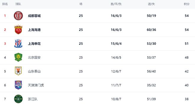 中超争冠格局大乱。成都蓉城艰难拿到1分,这让成都蓉城以54分依然排名榜首位置。上海海港这轮击败了北京国安,总积分也是54分,排名第2。上海申花只拿到1分,总积分是51分,排名第3。前2球队积分相同,前3球队差距最多2分,竞争真是太激烈了。