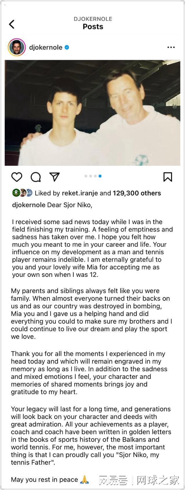 德约科维奇在悼文的结尾写道:“安息吧”无声地诉说着失去至亲般的痛楚。