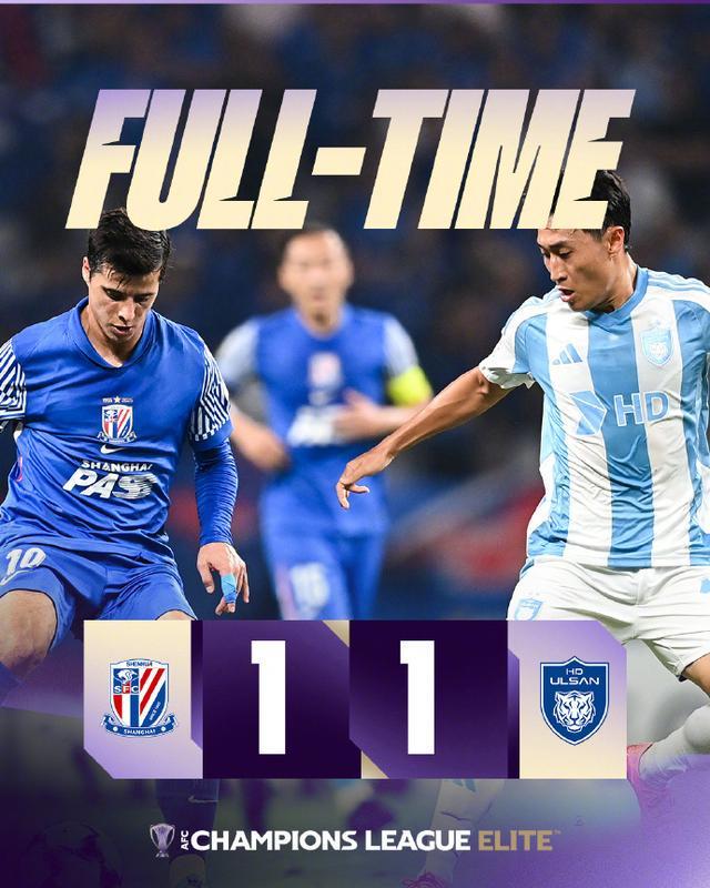 上海申花本轮主场1比1平蔚山HD队。