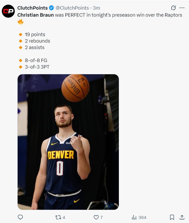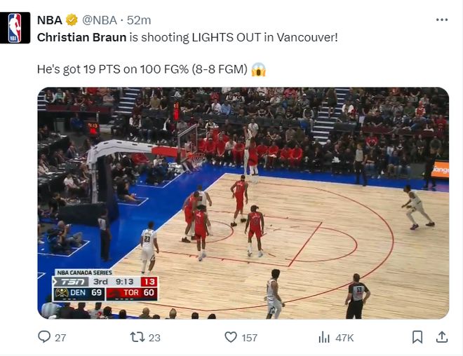 第二节1中1,第三节2中2+三分1中1,全场比赛22分钟,8中8+三分3中3拿到19分2篮板2助攻2抢断,NBA官方晒出布劳恩8中8的集锦发了一个惊呼的表情。
