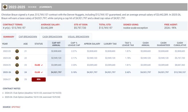 他25-26赛季已经是新秀合同的最后一年,他在10月20日前可以与掘金达成提前续约(顶薪是五年2.47亿含激励条款),如果今夏他无法与掘金达成续约明夏将成为受限制的自由球员,届时很多球队就可以报价,如果他真的能继续成长,那么24岁的布劳恩有希望拿到2亿的超高合同。