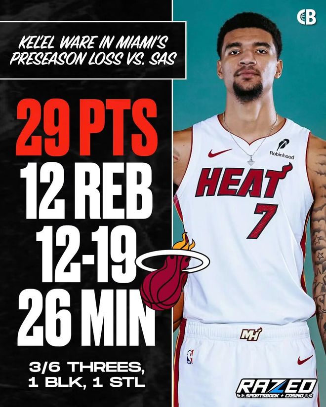 热火季前赛107-112不敌马刺-4,吞下三连败,但南滩球迷却仿佛提前收到了最好的新年礼物——二年级中锋克莱尔·韦尔用一场震惊四座的表演,让整个NBA开始重新审视这支球队的潜力。替补登场26分钟,19投12中,三分6中3,罚球3中2,狂砍29分12篮板1助攻1抢断1盖帽——这不是某个超级巨星的数据单,而是这位21岁小将在季前赛交出的成绩单。29分不仅刷新了他个人季前赛+常规赛的得分纪录,更让美媒惊呼“热火自研文班”正在成型。
