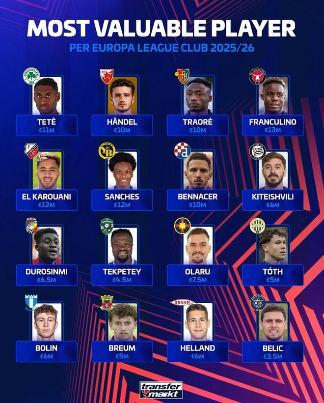 - 欧联杯 | 欧联杯各队身价最高球员:怀特、罗杰斯6500万第1,安东尼上榜