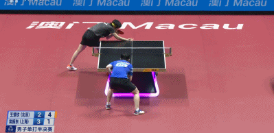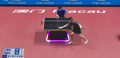 但是王楚钦在发球环节给樊振东极大压力——1比3,王楚钦发了一个台角保护的半出台,樊振东一吊,被早等在位置的王楚钦一个倒地爆冲。