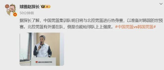国内知名媒体人报道,中国男篮将与北控队进行热身赛,以此备战11月28日(主场)-12月1日(客场)两战韩国男篮的世预赛。中国男篮于11月14日在国家体育总局训练局开始集训,11月27日结束。