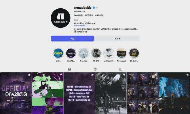 此外,Armada 在社媒上非常善于利用“局部叙事”强化文化氛围。例如,它会在 Reels 推出系列短片,用固定主题贯穿不同滑手的片段,让品牌在视觉上形成统一调性;也会配合雪季节奏推出“early season”“powder day”“park laps”等标签,让用户在看到这些内容时自动联想到雪季开始的兴奋感,从情绪上被拉入滑雪的文化氛围中。