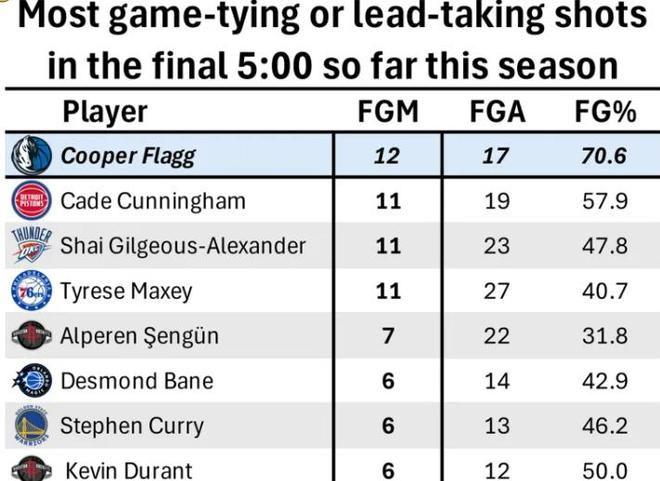 12月17日,美国媒体Extra晒出本赛季,NBA球员最后五分钟投进追平或者反超球的数据!其中弗拉格命中率最高,本赛季关键时刻,他17投12中,命中率高达70.6%,排名弗拉格之后的坎宁安和亚历山大,命中率都不如弗拉格!
