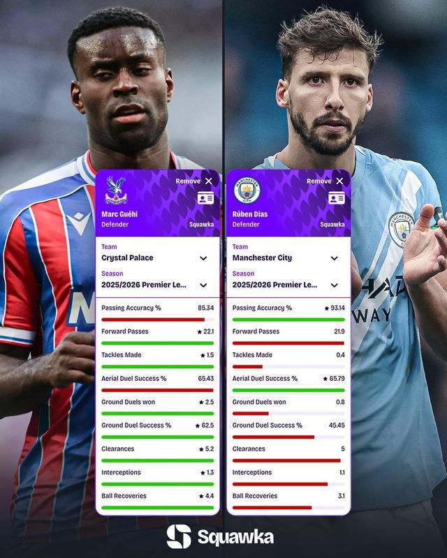 北京时间1月19日,在曼城官宣他们引进水晶宫队长格伊之后,知名数据机构Squawka对比了格伊与鲁本-迪亚斯本赛季至今的英超场均数据。